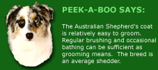 | Australian Shepherd Breed Characteristics and Temperament Courtesy of U.S. Australian Shepherd Association TEMPERAMENT The Australian Shepherd is an intelligent, medium-sized dog of strong herding and guardian instincts. He is also a delightful and loyal companion and a great family dog. He loves to be part of the daily hustle and bustle, and enjoys riding in the vehicle just to be with his beloved master. As a farm dog, he diligently carries out his responsibilities, be they bringing in the stock or finding that stray one that got tangled in the brush. He is easy to train, easy to housebreak, and eager to please. Aussies have been used as seeing-eye dogs, as utility dogs to the physically handicapped, hearing aid dogs, police and narcotics dogs and search and rescue dogs. In the northern areas they have also been used as sled dogs. Many go with their masters as volunteers to children's homes and nursing homes to do therapy work. Truly, the Australian Shepherd is a highly versatile dog. The Aussie (as he is lovingly nicknamed) is a very active dog that needs a great deal of exercise on a daily basis to prevent him from become bored or frustrated and developing destructive habits. Because of their high energy level, combined with high intelligence, Aussies need to be given a "job" to perform, be it shepherding the children, protecting the house, herding livestock or competing in dog events. One of the most frequent reasons Aussies are turned over to rescue groups is because their owners didn't realize how much energy the breed has, and weren't willing to channel that energy through training. Aussies are also quite demanding of their owners' time and attention and want to be constantly with them, following them from room to room in the house, and going along in the car or truck on errands. They can be highly territorial and protective of their masters' possessions, which can cause serious difficulties unless controlled with proper training. COLORS The Australian Shepherd comes in four acceptable colors: black, blue merle (a marbling of gray and black), red (ranging from light cinnamon to liver), and red merle (marbling of red and silver or buff). A variety of white and tan markings may appear on the face, chest, front and rear legs. The outer coat is of moderate length, with a texture that is straight to wavy and weather resistant. The undercoat is soft and dense, and the amount varies with climate. Tails are naturally bobbed or docked. Ears are moderately sized, and break forward and over, or the side as rose ears. Males weigh approximately 50 to 65 pounds, measuring from 20 to 23 inches, and females weigh about 40 to 55 pounds, measuring from 18 to 21 inches. The eyes of the Australian Shepherd are perhaps one of his most commented on features because of the variety of colors. They may be any color or combination of colors from glassy blue, amber, hazel, to all shades of brown. BREED HISTORY While there are many theories as to the origin of the Australian Shepherd, the breed as we know it today developed exclusively in the United States. The Australian Shepherd was given its name because of their association with the Basque sheepherders who came to the United States from Australia in the 1800's. The Aussie rose rapidly in popularity with the boom of western riding after World War II, becoming known to the general public via rodeos, horse shows, movies and television. Their inherent versatility and trainability made them useful on American farms and ranches. The American stockmen continued the development of the breed, maintaining the versatility, keen intelligence, strong herding instinct and eye-catching appearance.